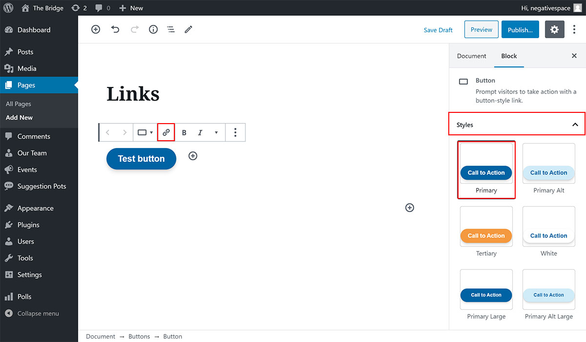 Similarly to the Heading block, buttons come with predefined styles that can change the button design. To choose a style, simply expand the Styles dropdown menu and click on a preview button to apply the style as highlighted below.