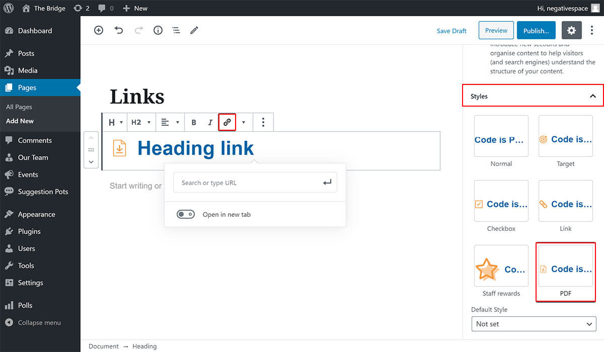 In addition to the link control, the Heading block comes with predefined styles that can add an icon to the left hand side of the heading and further enhance the heading's definition (e.g. PDF link). To add a style, simply expand the Styles dropdown menu and click on a preview button to apply the style as highlighted below.