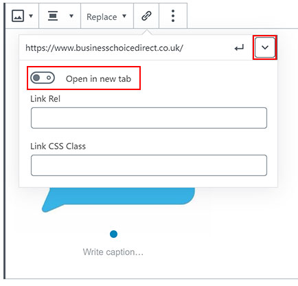 Note: to set the image link to open in a new tab, click on the expand button (highlighted below) and enable the Open in new tab toggle.