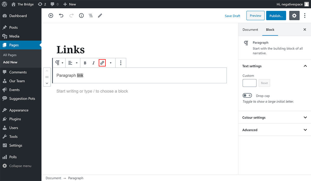 The Paragraph block comes with a link control that can add a link to a selected piece of text. To use this link control, simply: