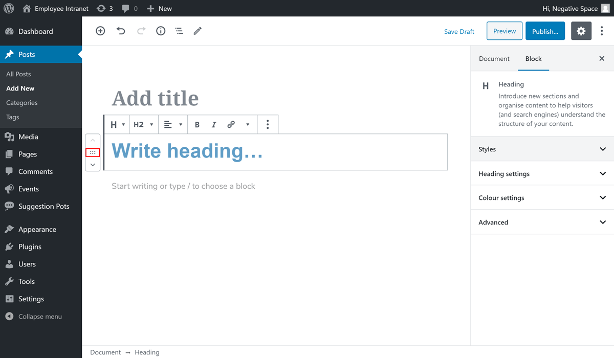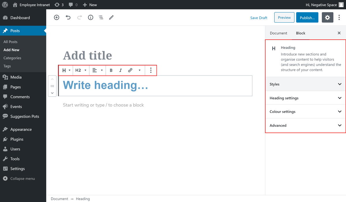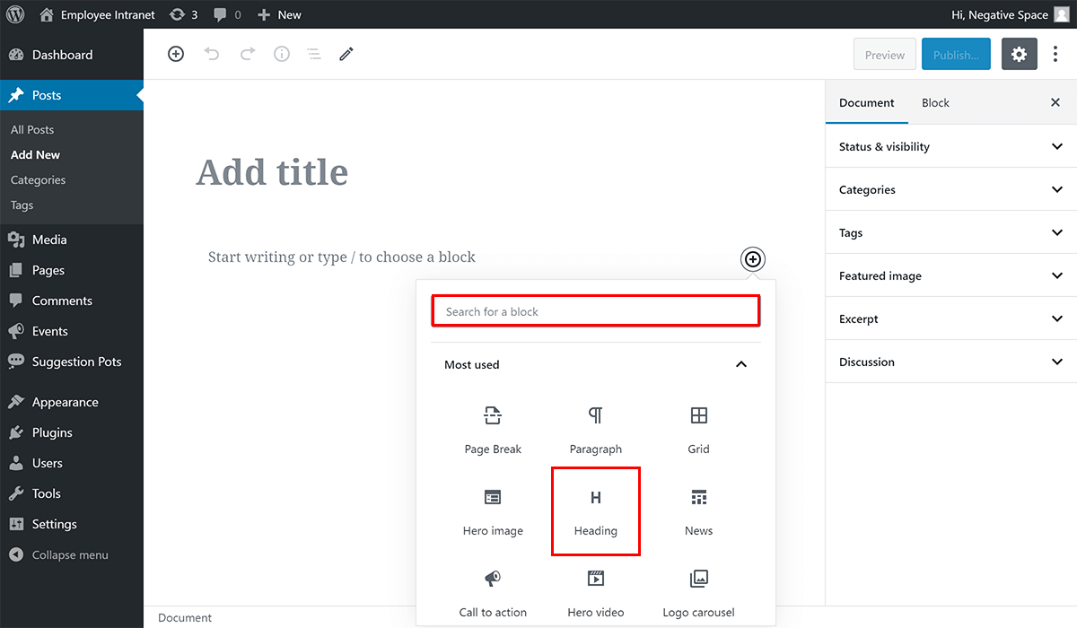 and then click on the block you wish to add (e.g. Heading - highlighted below). You can find a specific block by using the search bar - highlighted below.