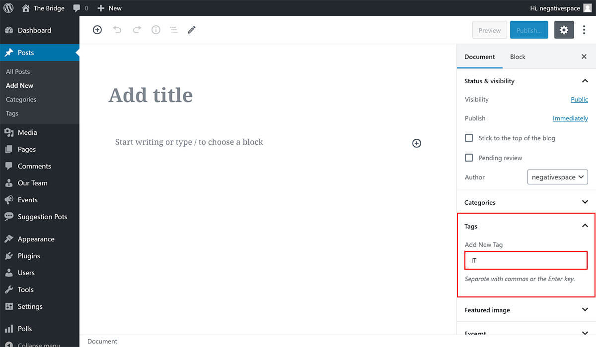 To select an existing tag, simply start typing the tag and select it from the suggestions dropdown (highlighted below) that is automatically generated by WordPress.