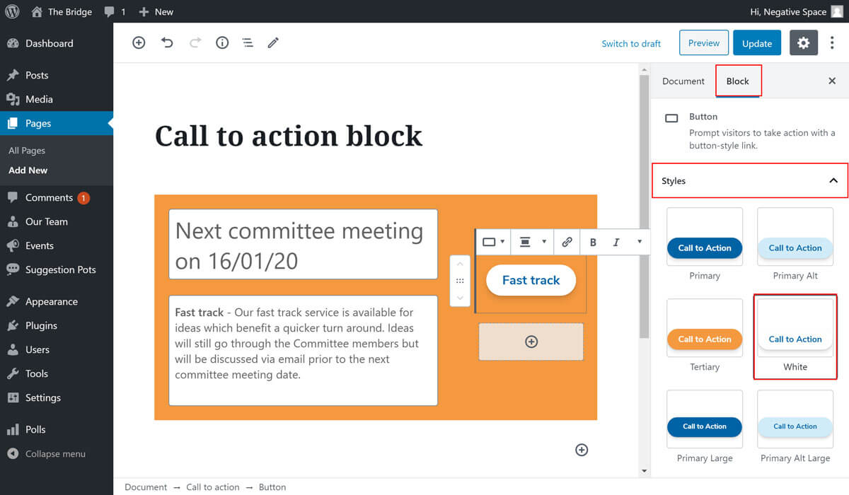 Once you finished configuring your block, click on Update or Publish to save your changes.