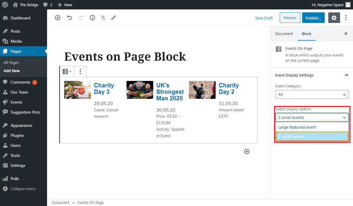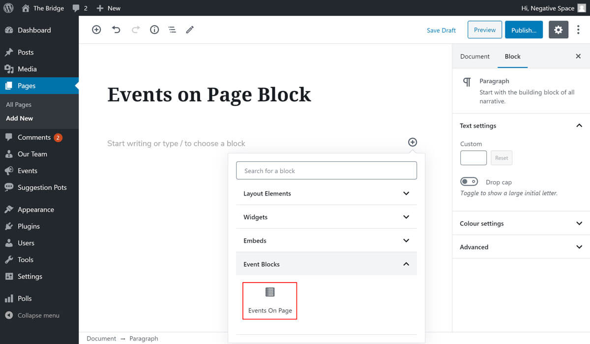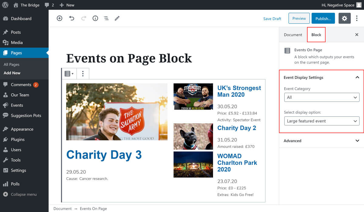 The Events on Page Gutenberg block allows you to promote your events on other site pages or within news articles. You can add the block to your page in the same way you would any other type of content, giving you full control over its position on the page.