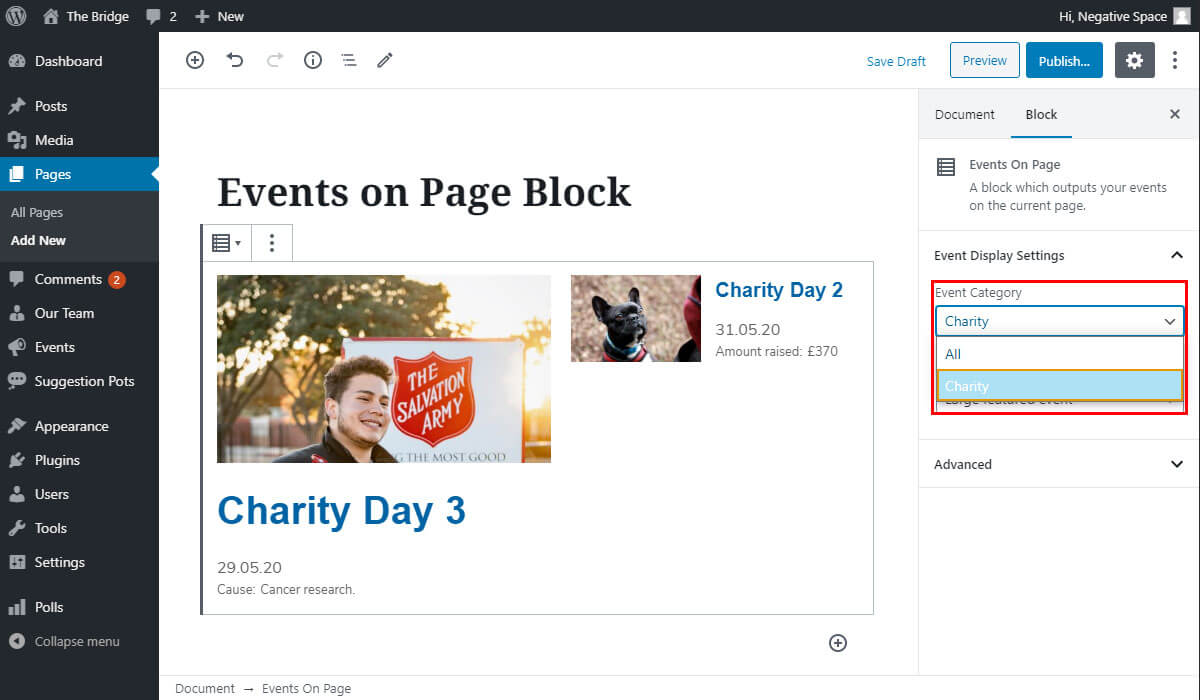 Selecting a specific event category will cause the block to only include events that have been assigned that category.