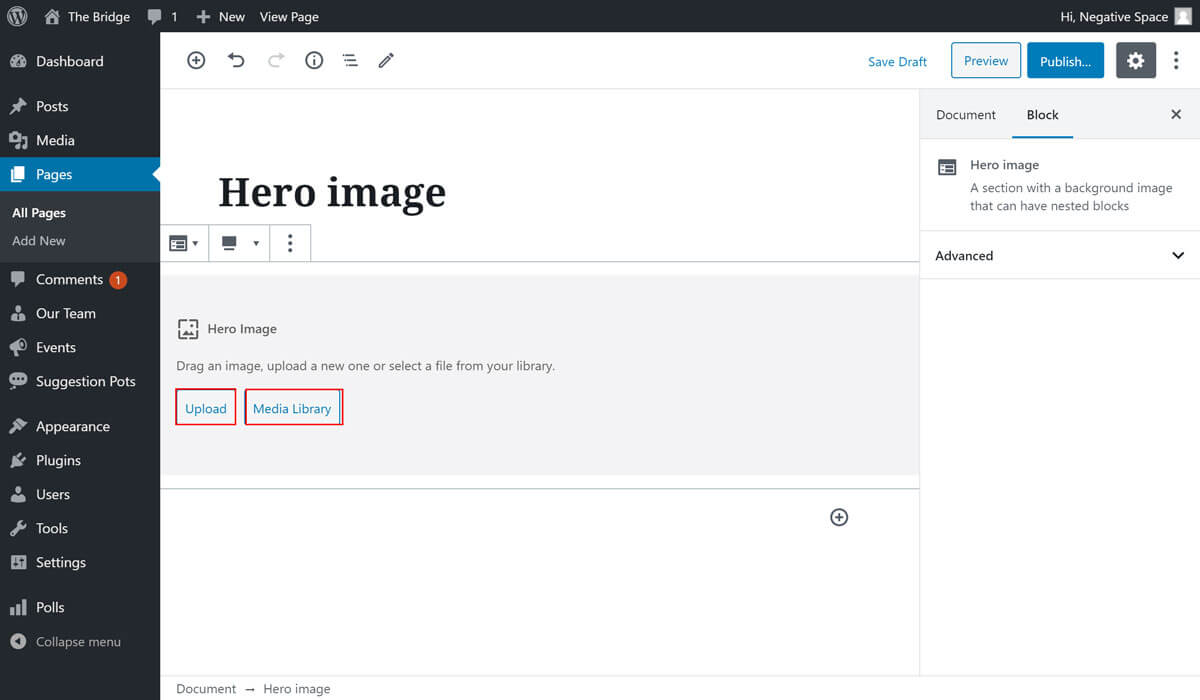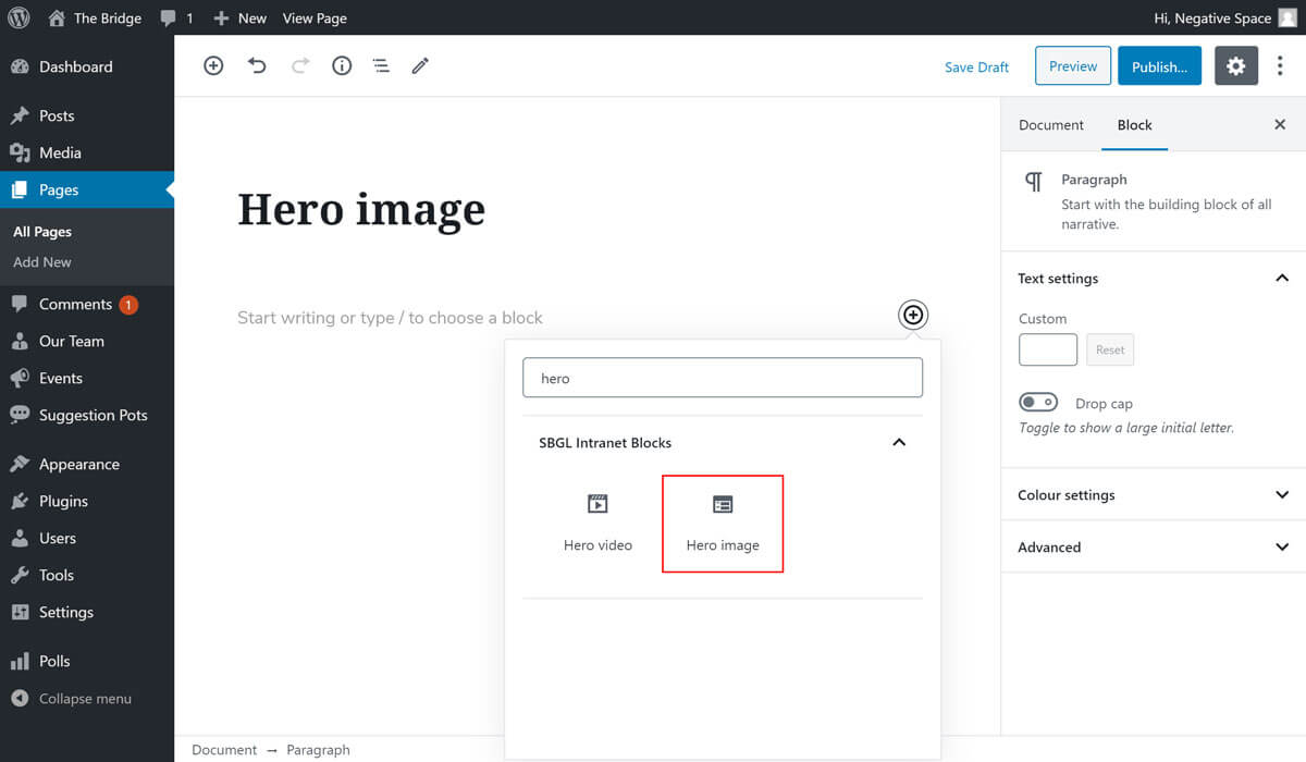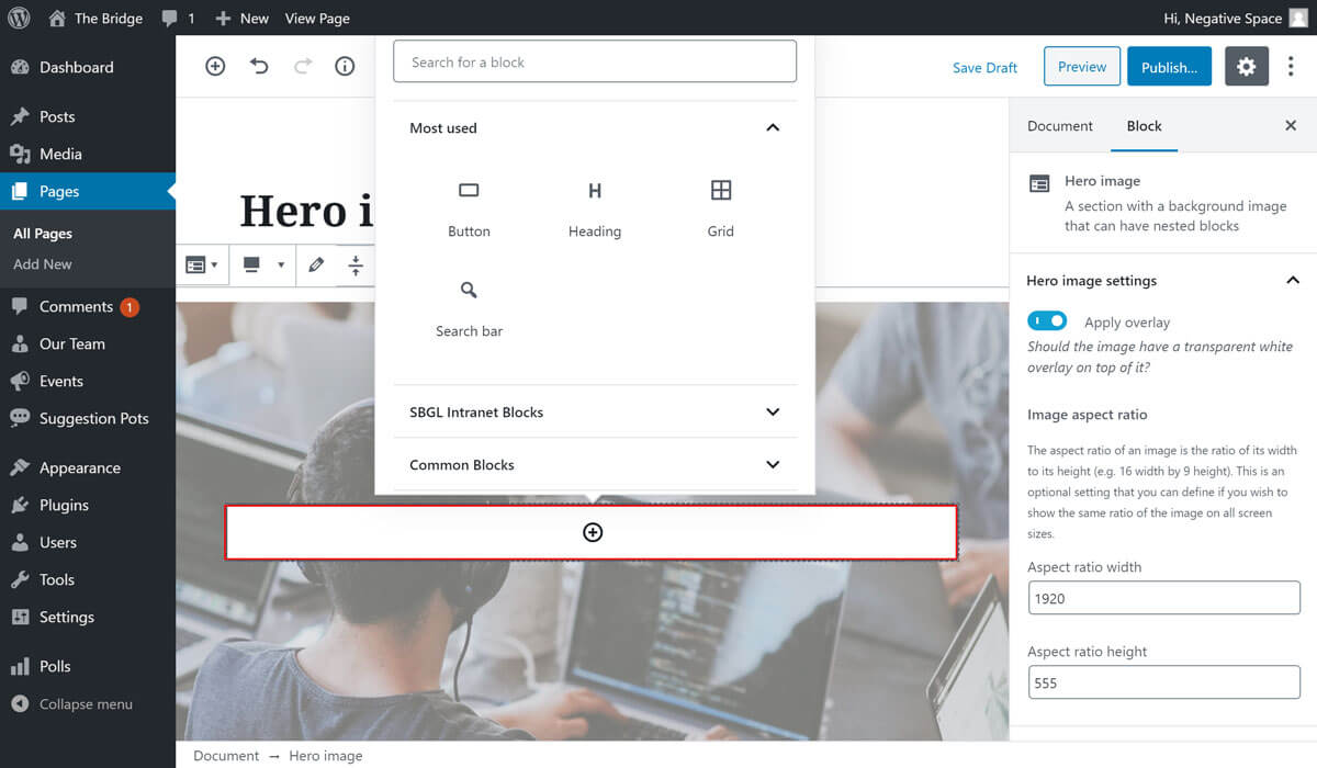 If you wish to add a block within the hero image, simply click on the plus button highlighted below and select the block that you wish to add.