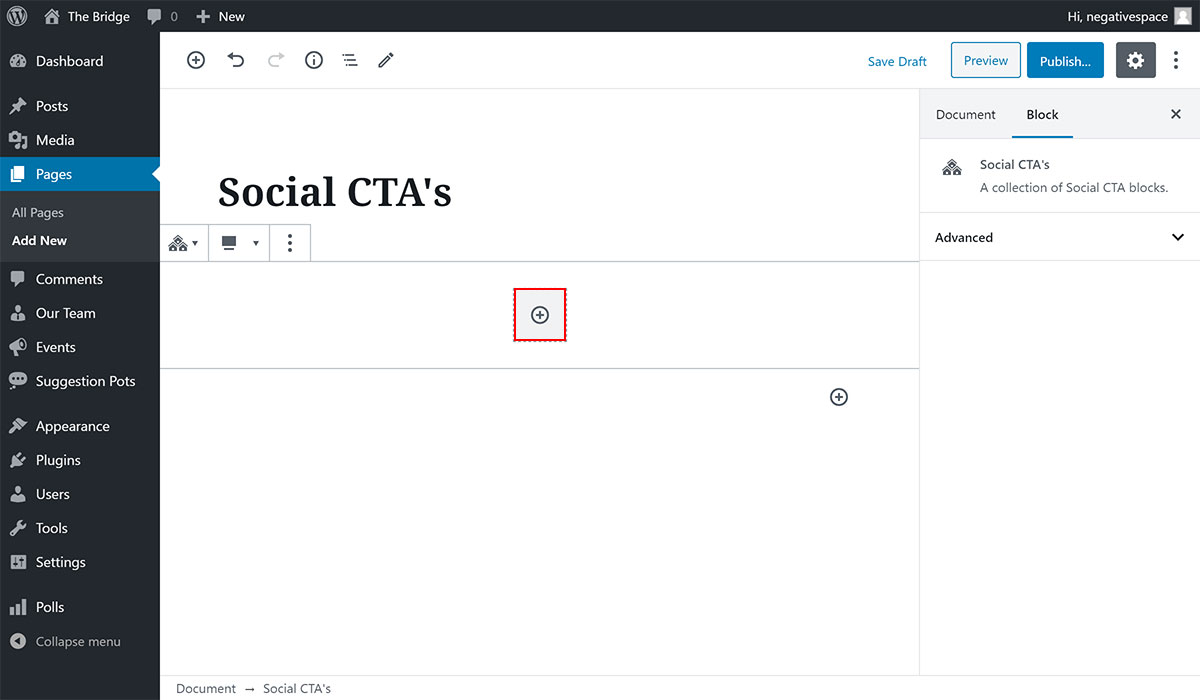Once you add the Social CTA's block you can start adding each individual Social CTA block by clicking on the plus button highlighted below.