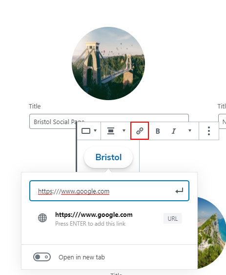 Click on the link button (highlighted below) to set or change the URL that the button links to.