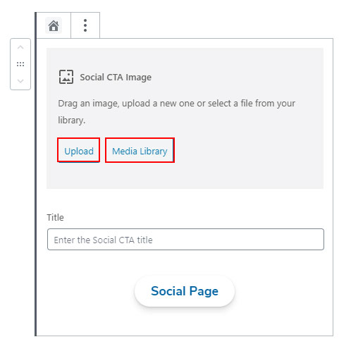 Each Social CTA block features a circular image at the top. You can choose upload any image to use in that section (doesn't have to be circular) by either clicking on the Upload button (highlighted below) and adding a new image or by clicking on the Media Library (highlighted below) button and using from one of the existing images in the media library.
