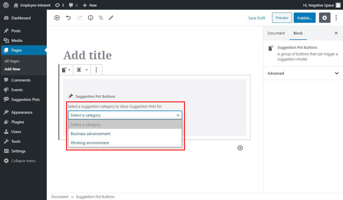 Suggestion Pot buttons is a block that displays a group of Suggestion Pot buttons grouped by their category, e.g. "Business advancement pots".