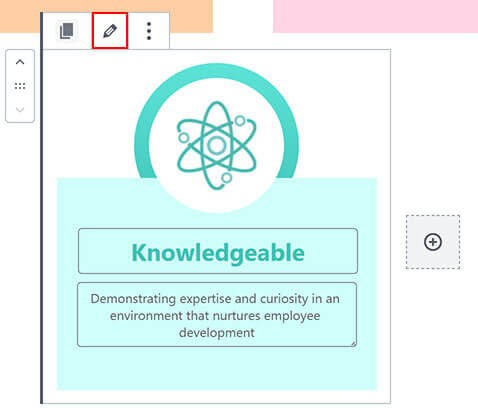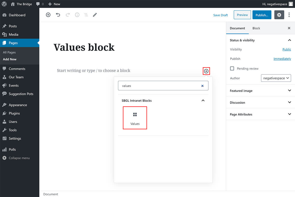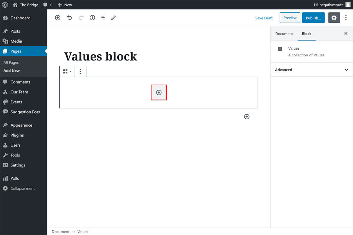 Once you add the Values block you can start adding each individual Value block by clicking on the plus button highlighted below.