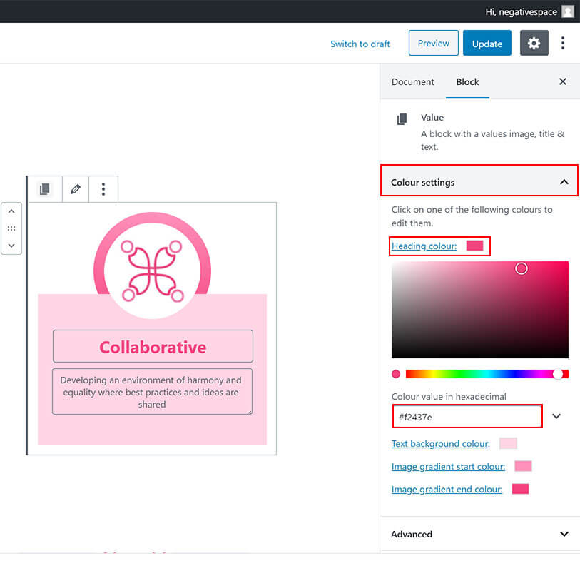 You can configure the text and background colours for each Value block by expanding the Colour settings dropdown for that block (highlighted below), clicking on the colour you wish to change and then using the colour picker or setting the hexadecimal colour value in the respective field (highlighted below).