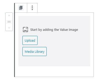 The first step after adding a Value block is to choose an image by either uploading a new one or by using the Media Library as shown below.